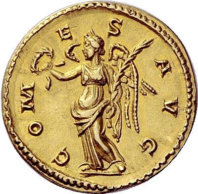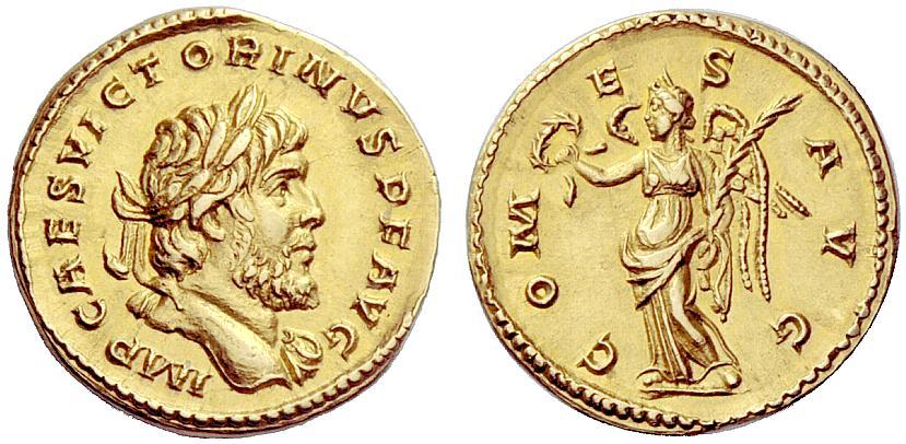 The Roman Empire. Victorinus, 269–271. Aureus, Colonia late 269, AV 6.14g. IMP CAES VICTORINVS P F AVG Laureate bust r., drapery on l. shoulder. Rev. COM–E–S AVG Victory standing l., holding wreath and palm branch. C 16 var. (no drapery). RIC 94 var. (no drapery). Schulte 6a (this obverse die), reverse die unlisted. Kent-Hirmer pl. 134, 517 (this obverse die). Calicó 3811 (this coin). Biaggi 1539 (this coin). Very rare. A very attractive portrait and a light reddish tone. Light traces of mounting on edge, otherwise extremely fine. Ex NAC sale 40, 2007, 820. From the Biaggi collection. M. Piavonius Victorinus was the penultimate usurper in Gallia during the period of military anarchy. He was born to a noble family and had a brilliant military career, culminating in his becoming Postumus’ tribune and colleague on the IV consulate. After Postumus’ death during the siege of Mogontiacum, Victorius was declared emperor of the independent realm of the north-west. The Storia Augusta, which lists him as one of the ‘thirty tyrants’ (or rather thirty usurpers or anti- emperors), records this brief political parable: “When Lollianus was eventually killed, Victorinus found himself the only figure in power, but this was not to last. He wasted his time chasing and molesting the wives of both soldiers and officers until one day, in the vicinity of Agrippina (Colonia) he was assassinated as the result of a plot organised by a clerk whose wife he had raped.”