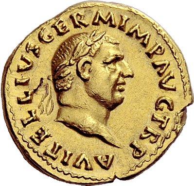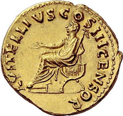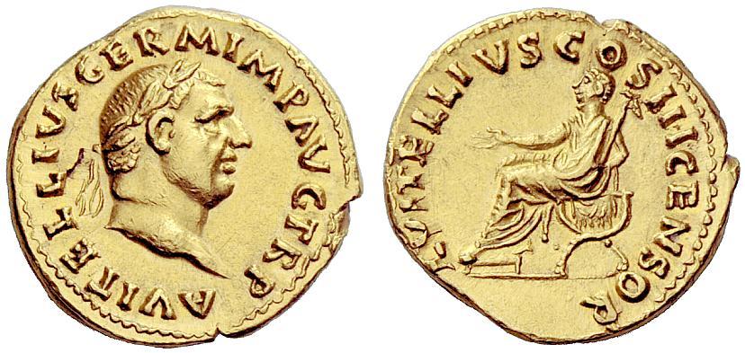The Roman Empire. Vitellius, April–December 69. Aureus late April-December 69, AV 7.30g. A VITELLIVS GERM IMP AVG TR P Laureate head r. Rev. L VITELLIVS COS III CENSOR Lucius Vitellius, togate, seated l. on curule chair, feet on stool, holding eagle-tipped sceptre in l. hand and extending r. C 54 var. (branch in r. hand). BMC 23. RIC 94. CBN 54. Calicó 565b (this coin). Very rare. A metal flaw on obverse behind head, otherwise extremely fine. Ex Triton IV, 2000, 491; NAC 24, 2002, European Nobleman, 44 and NAC 41, 2007, 58 sales. Each of Romes emperors (except Otho, whose lineage was not particularly distinguished) had celebrated their ancestors as a means of buoying their own legitimacy. Augustus made the most of his relationship with Julius Caesar, Tiberius did likewise with Augustus and Livia, Caligula and Claudius honored the many nobles from whom they were descended, and Nero initially trumpeted Agrippina and Claudius. Even Galba–the first non-Julio-Claudian emperor–trumpeted his close ties to the deified Livia. On this rare aureus, the newest emperor Vitellius acts likewise: he celebrates his illustrious father, Lucius Vitellius, who, as the reverse inscription indicates, was Censor and held the Consulship three times. Vitellius father was undoubtedly the most important politician of his age. He was a shameless flatterer who would avert his eyes and prostrate himself in the presence of emperors and empresses; we are told he would even kiss the feet of Claudius third wife Messallina. He was pragmatic in his dealings with Tiberius: not only did he ‘provide his son (the future emperor Vitellius) to Tiberius as one of his male prostitutes during his final years on Capri, but also he was skilful enough to survive the reign of Caligula. Under Claudius–who was perpetually at odds with the senate–Lucius reached the zenith of his career, running the government while Claudius was leading an invasion of Britain. After an illustrious, if not prideful, career, Lucius Vitellius probably died late in the reign of Claudius or early in the reign of Nero, long before the most famous of his four sons became emperor.