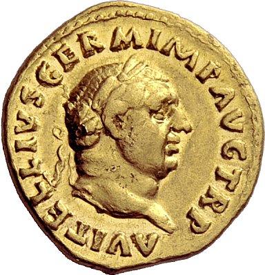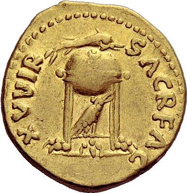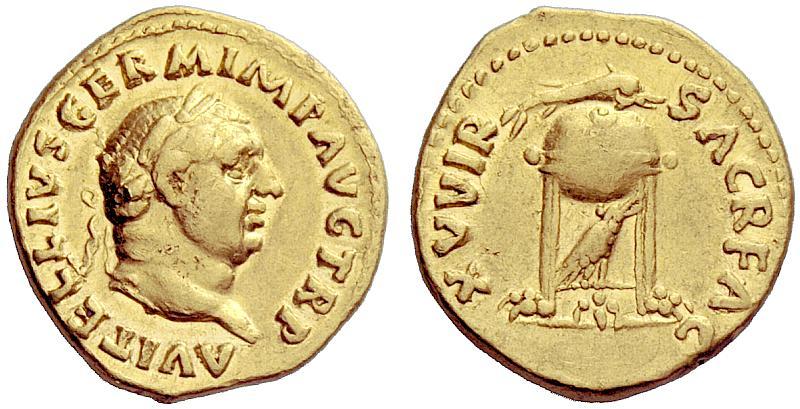 The Roman Empire. Vitellius, April–December 69. Aureus late April-December 69, AV 7.32g. A VITELLIVS GERM IMP AVG TR P Laureate head r. Rev. XV–VIR SACR FAC Tripod with dolphin set r. on top and raven standing r. below. C 110. BMC 38. RIC 108. CBN 75. Calicó 584. Very rare. Struck on a very broad flan and good very fine