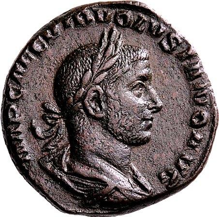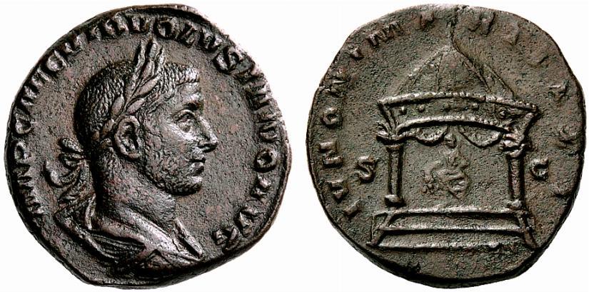 The Roman Empire. Volusian, 251–253. Sestertius 251-253, Æ 18.84g. IMP CAE C VIB VOLVSIANO AVG Laureate, draped and cuirassed bust r. Rev. IVNONI MARTIALI S–C Juno seated within distyle temple. C 46. RIC 253a. Brown tone and about extremely fine. From the Luc Girard collection.