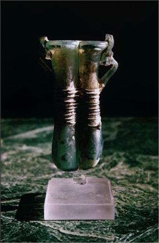 Roman Glass Bottle. C. 1st century A.D. Pale green glass, 5" high, a "twin" vase or bottle, each of the two 1" wide, and joined together by eleven strands of glass in center. Some interior inclusions from archæological dig lending a rosy hue to appearance. Vestige of handle across top. Separate custom-built lucite display stand. Beautiful.