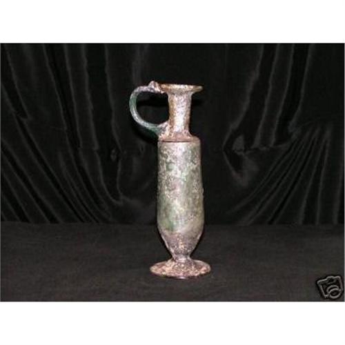On sale is a very rare "Roman Glass Vessel" circa 100A.D. to 300 A.D. This very unique glass has a single trailed handle to the shoulder and rim, ending with a stylistic Ram's head. The lower vessel is stemmed to the base and was used as a cup. This unique Roman Glass relic is permeated with a wonderful golden, light blue and a rarely seen iridescence! The upper portion is split and has a small hairline crack at the base.