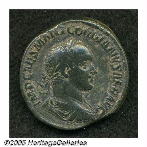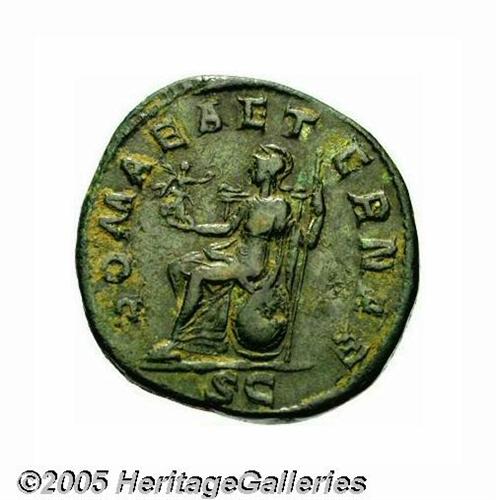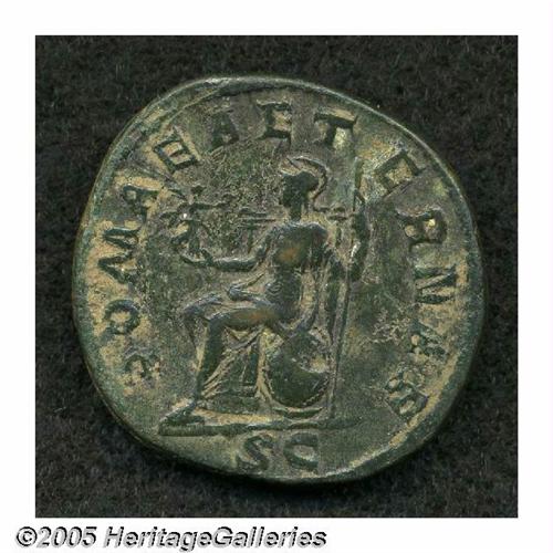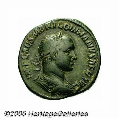 <B>Gordian II.</B></I> A.D. 238. AE sestertius (30 mm, 21.17 g). Laureate, draped and cuirassed bust right / Roma seated left on shield, holding small Victory in right hand, sceptre in left. RIC 5; Cohen 9. Near VF, green patina.