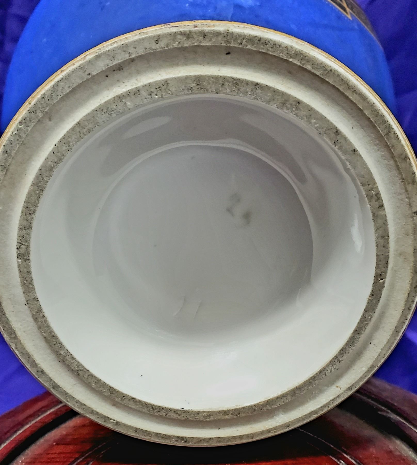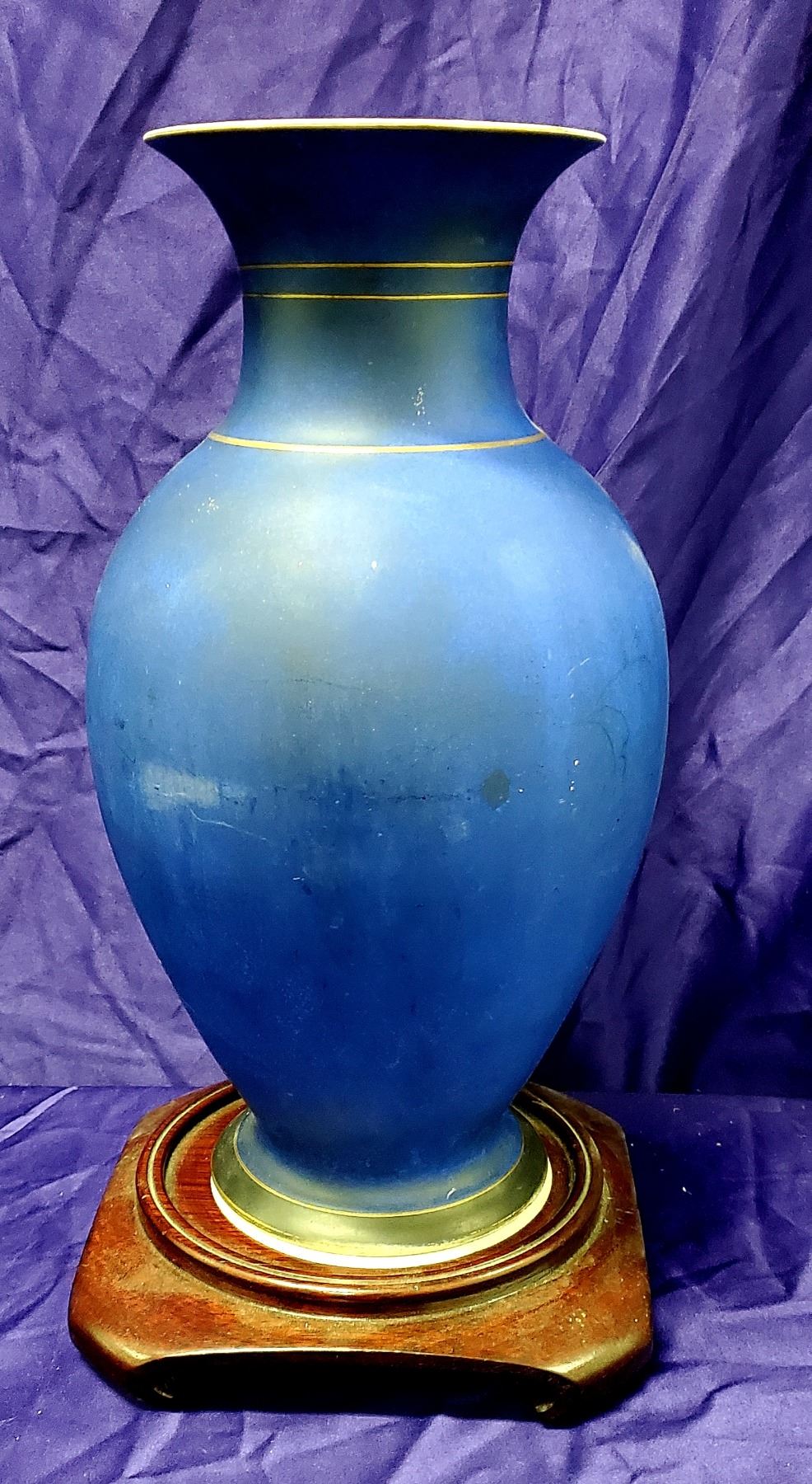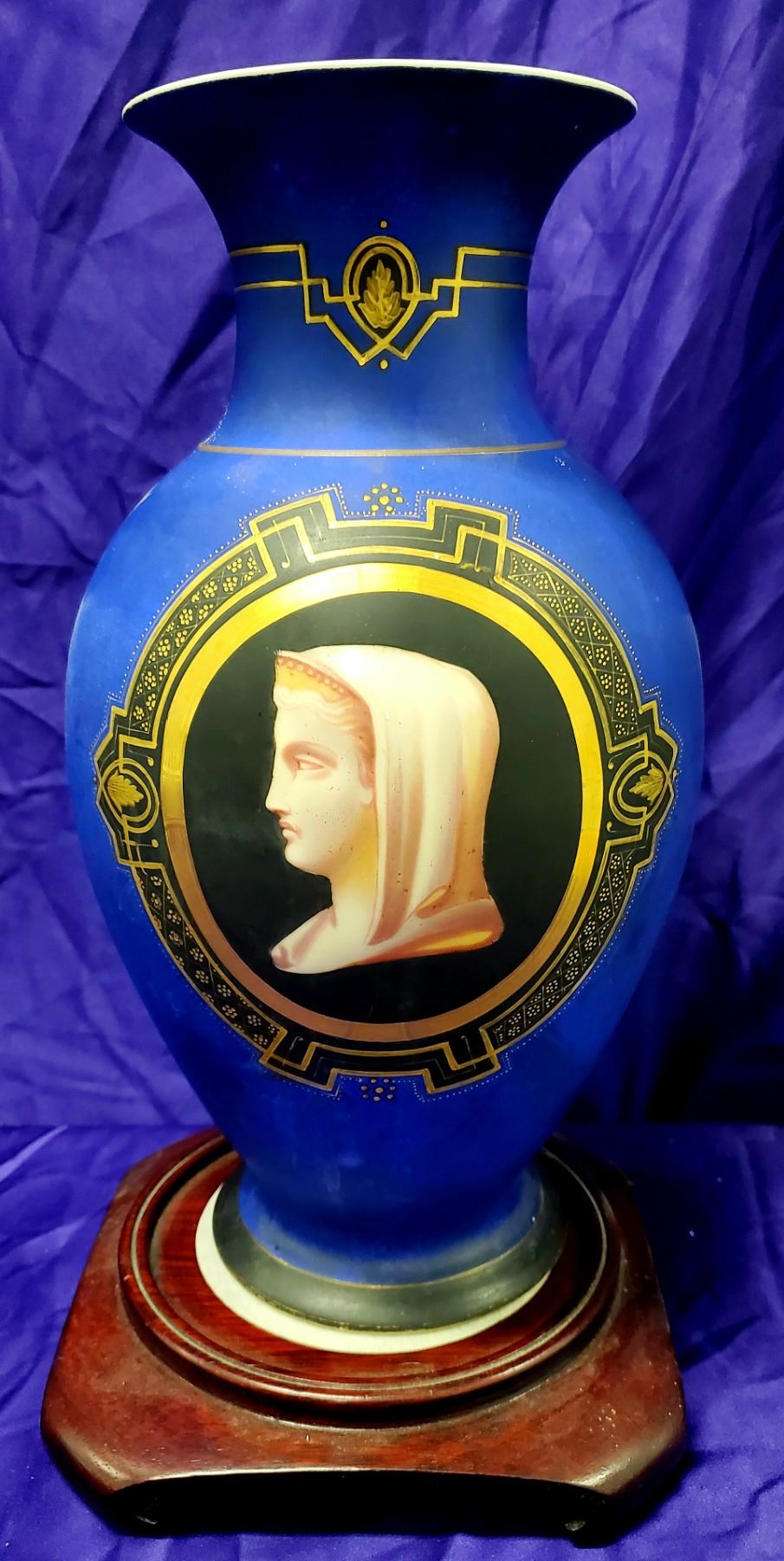 A Large 13 inch H x 7 inch Wide Roman Greco glass Vase. This Vase has a milky white interior and is Garnished by Neo Classical, Greco Roman meander patterns. The classical patterns convene at the Portrait of a Regal Woman figure wearing a Headpiece.There is a copious amount of Gold Gilding detail is enhanced by the Colbalt Blue color of the Vase. This centerpiece is in good condition.