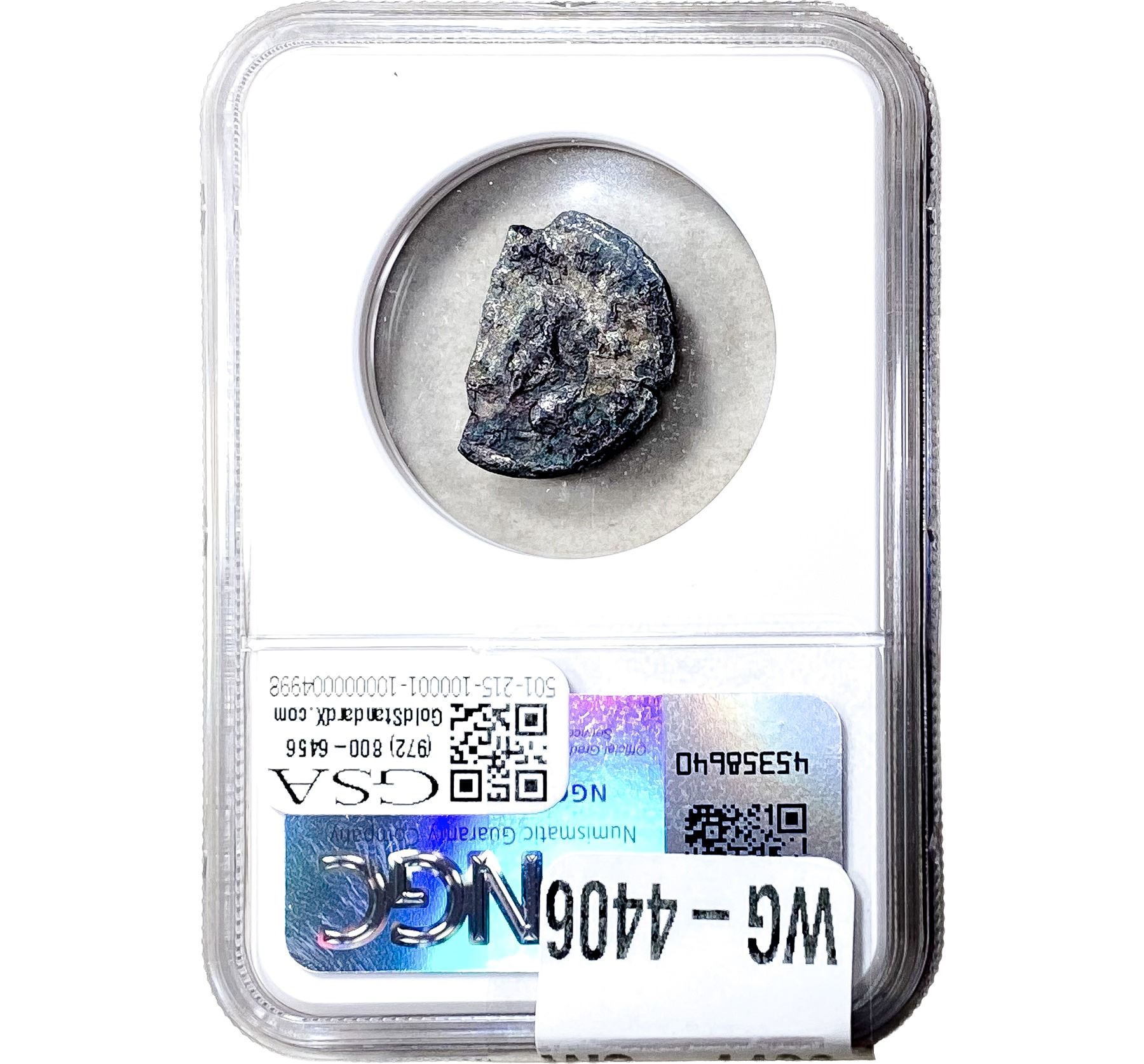e. Coins sold referencing a third-party grading service are sold “AS IS” without any express or implied warranty, except for a guarantee by GSA that they are genuine. Removal or alteration of the holder, voids all of Bidder’s claims concerning that Product. Certain warranties may be available from the grading services and Bidders are referred to them for further details: Numismatic Guaranty Corporation (NGC), PO Box 4776, Sarasota, FL 34230, www.ngccoin.com/services/writtenguarantee.asp; Professional Coin Grading Services (PCGS), PO Box 9458, Newport Beach, CA 92658, www.pcgs.com/guarantee.html; ANACS, 6555 S. Kenton St., Ste. 303, Englewood, CO 80111; and Independent Coin Grading Co. (ICG), 7901 East Bellview, Ave., Suite 50, Englewood, CO 80111.