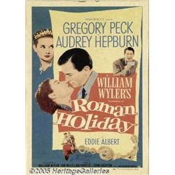 <B>Roman Holiday (Paramount, 1953)</B></I> Window Card (14" X 18"). Twenty-four-year-old Audrey Hepburn won an Academy Award for her portrayal of Princess Anne, a young woman who longs to escape her political heritage and have some fun before she is paralyzed by "affairs of state." By chance she happens to meet American journalist Joe Bradley (Gregory Peck), who recognizes her, but pretends that he doesn't in hopes of obtaining an exclusive interview. This wonderful romance is the film that catapulted Hepburn to fame. There is a touch of toning to the edges, one pinholes and a few light surface wrinkles. About four inches has been trimmed from the blank top and the card has been mounted on cardboard. Very Good.