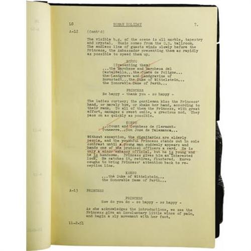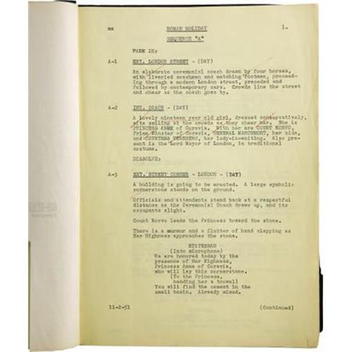 <B>"Roman Holiday" Script.</B></I> An original screenplay for William Wyler's <I>Roman Holiday,</B></I> with the first page crediting Ben Hecht as the author, or "script doctor," of this second draft (SF 83316, dated November 5, 1951). Many others were rumored to have worked on the screenplay, including Preston Sturges, but the original story was written by blacklisted virtuoso Dalton Trumbo -- though at the time he was not allowed credit for the Oscar-winning masterpiece. A fascinating remnant of McCarthyism, it marks the first starring role of a young Audrey Hepburn, who also won an Oscar for her performance. Marked with notations in red pencil, the folder-bound script more than likely belonged to an assistant director and is in Very Good condition with corner and border wear to the script pages and handling wear to the cover.<BR><BR><b>Shipping:</b> Books & Catalogs (<a target="_blank" href="http://www.heritageauctions.com/common/shipping.php">view shipping information</a>)