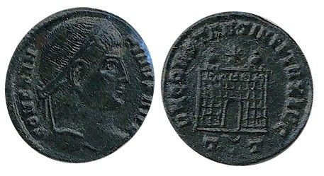 Roman Imperial Coinage; Constantine the Great Follis. Obv: CONSTAN-TINVS AVG; Rev: D N CONSTANTINI MAX AVG. Camp gate with two turrets. Ticinum Ric 198 c. 326. VF for grade.