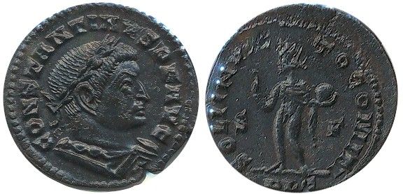 Roman Imperial Coinage; Constantine the Great Follis. Obv: CONSTANTINVS AVG; Rev: SOLI INVIC-TO COMITI. Sol standing left holding globe. Lugdunum Ric 7 c. 313-14. EF for grade.