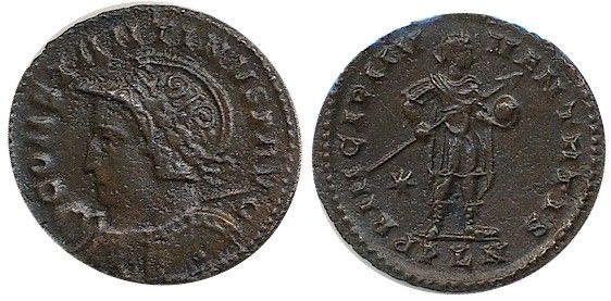 Roman Imperial Coinage; Constantine the Great Follis. Obv: CONSTANTINVS P AV-G; Rev: PRINCIPIA IV-VENTVTIS. Prince standing holding spear and globe. London Ric 222 c. 310-12. VF for grade.