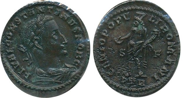 Roman Imperial Coinage; Constantine the Great Follis. Obv: FL VAL CONSTANTINVS NOB C; Rev: GENIO POPV-LI ROMANI. Genius standing left. Trier Ric666 c. 306-7. EF for grade.