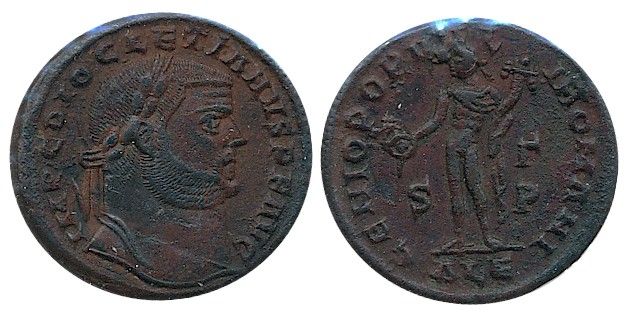 Roman Imperial Coinage; Diocletian Follis. Obv: IMP C DIOCLETIANVS P F AVG; Rev: GENIO POPV-L-I ROMANI. Genius standing left. Alexandria Ric 34a c. 303-3. VF for grade.