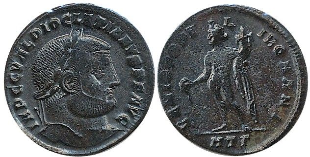 Roman Imperial Coinage; Diocletian Follis. Obv: IMP CC VAL DIOCLETIANVS P F AVG; Rev: GENIO POPV-L-I ROMANNI. Genius standing left. Heraclea Ric 19a c. 297-8. EF for grade.