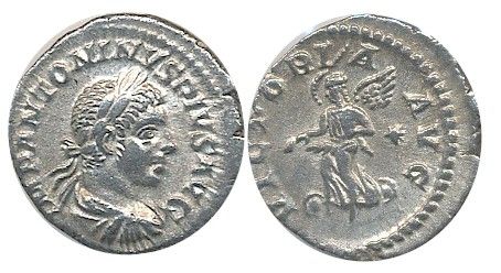 Roman Imperial Coinage; Elagabalus Denarius. Obv: IMP ANTONINVS PIVS AVG; Rev: VICTORIA AVG. Victory walking left. C. 218-222 EF for grade.