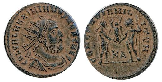 Roman Imperial Coinage; Galerius Antoninianus. Obv: GAL VAL MAXIMIANVS NOB CAES; Rev: CONCORDIA MIL-ITVM. Prince standing right receiving victory from Jupitor standing left. Cyzicus Ric 19b c. 295-6. EF for grade.
