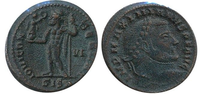 Roman Imperial Coinage; Galerius Follis. Obv: IMP MAXIMIANVS P F AVG; Rev: IOVI CON-SERVAT. Jupiter standing left. Siscia Ric 179b c. 305-7. VF for grade.