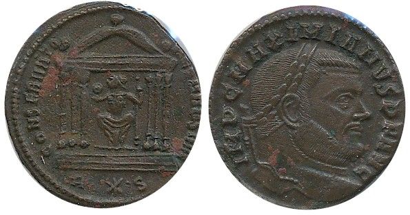 Roman Imperial Coinage; Maximian Follis. Obv: IMP C MAXIMIANVS P F AVG; Rev: CONSER V -VRB SVAE. Roma seated in hexastyle temple. Rome Ric 194b c. 307. VF for grade.