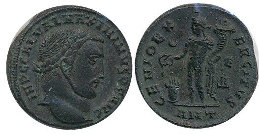 Roman Imperial Coinage; Maximinus II Follis. Obv: IMP C GAL VAL MAXIMINVS P F AVG; Rev: GENIO EX-ERCITVS. Genius standing left. Antioch Ric 147c c. 310-11. EF for grade.