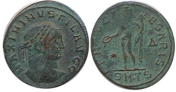 Roman Imperial Coinage; Maximinus II Follis. Obv: MAXIMINVS FIL AVGG; Rev: GENIO CA-ESARIS. Genius standing left. Thessalonica Ric 32a c. 308-10. VF for grade.