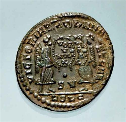 Roman Imperial Coins - Ae - Decenzio Cesare (351-353 d.C.) - Bronzo di modulo medio - Zecca: Lugdunum - Diritto: effigie del Cesare a destra - Rovescio: due Victoriae alate sostengono una corona di alloro - gr. 5.14 - Salto di conio al rovescio