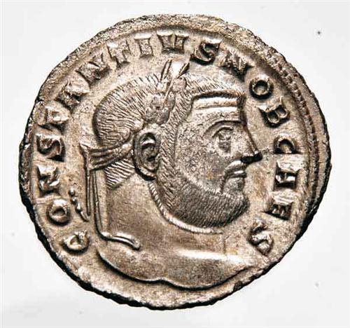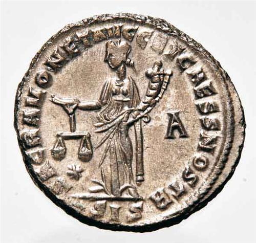 Monete Romane Imperiali - I Tetrarchia - Costanzo Cloro Cesare - Follis databile al 302 d.C. - Metallo: Mi - Zecca: Siscia - Diritto: effigie di Costanzo Cloro a destra - Rovescio: la dea Moneta stante a sinistra regge una bilancia con la mano destra e una cornucopia con la sinistra - gr. 9,66 - In piena argentatura - In lotto con una Maiorina di Costanzo II