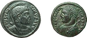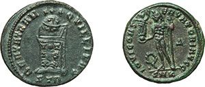 Roman Imperial. Constantine I (307-337). Lot of 2 folles, mints of Treveri (RIC 303) and Cizyco (RIC 8). AE. R. EF. Impero Romano. Costantino I (307-337). Lotto di 2 follis selezionati per le zecche di Treveri (RIC 303) e Cizyco (RIC 8). AE. R. SPL.