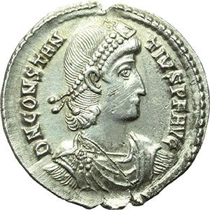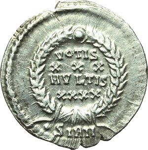 Roman Imperial. Constantius II (337-361). Siliqua, Sirmium. Obv.: DN CONSTANTIVS PF AVG. Diademed, draped and cuirassed bust right. Rev.: VOTIS/XXX/MVLTIS/XXXX within wreath. .SIRM below. RIC 17. AG. g. 3.21 mm. 22.00 About EF/EF. Impero Romano. Costanzo II (337-361). Siliqua, Sirmium. D/ DN CONSTANTIVS PF AVG. Busto diademato, drappeggiato e corazzato a destra. R/ VOTIS/XXX/MVLTIS/XXXX entro corona. Sotto, .SIRM. RIC 17. AG. g. 3.21 mm. 22.00 Graffito al D/, altrimenti qSPL/SPL.
