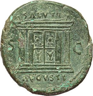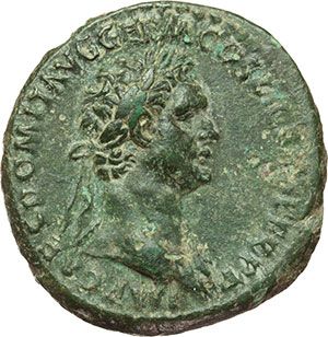 Roman Imperial. Domitian (81-96). As. Obv.: IMP CAES DOMIT AVG GERM COS XI CENS PER PP. Laureate bust right, wearing aegis. Rev.: SALVTI AVGVSTI SC. Altar. RIC 304 a. AE. g. 14.72 mm. 27.00 R. VF+/About EF. Rare. A very attractive coin. Impero Romano. Domiziano (81-96). Asse. D/ IMP CAES DOMIT AVG GERM COS XI CENS PER PP. Busto laureato a destra con egida. R/ SALVTI AVGVSTI SC. Altare monumentale. RIC 304 a. AE. g. 14.72 mm. 27.00 R. BB+/qSPL. Raro e molto attraente.