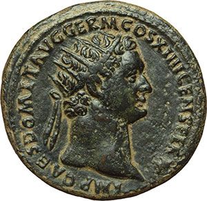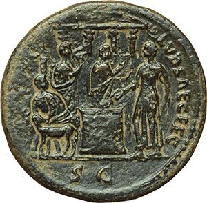Roman Imperial. Domitian (81-96). Dupondius, circa 88-89. Obv.: IMP CAES DOMIT AVG GERM COS XIIII CENS PER PP. Radiate head right. Rev.: [COS XIIII] LVD SAEC FEC SC. Domitian standing left, sacrificing over altar. Sacrificial lamb and victimarius to left. Harpist and flute player to right. Hexastyle temple in background. RIC 365. AE. g. 12.61 mm. 29.00 R. Few light cleaning marks, otherwise VF+. Impero Romano. Domiziano (81-96). Dupondio, ca. 88-89. D/ IMP CAES DOMIT AVG GERM COS XIIII CENS PER PP. Testa radiata a destra. R/ [COS XIIII] LVD SAEC FEC SC. Domiziano, stante a sinistra, sacrifica su altare di fronte a tempio esastilo. A sinistra, agnello sacrificale e victimarius. A destra, piano, arpista e suonatore di flauto. RIC 365. AE. g. 12.61 mm. 29.00 R. Tracce di abile pulitura, altrimenti bel BB+.
