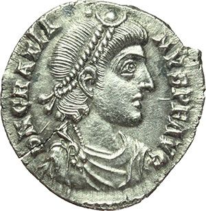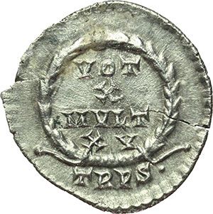 Roman Imperial. Gratian (367-383). Obv.: DN GRATIANVS PF AVG. Diademed, draped and cuirassed bust right. Rev.: VOT/X/MVLT/XV within wreath. TRPS below. RIC 44b. AG. g. 2.18 mm. 18.00 R. EF. Rare. Impero Romano. Graziano (367-383). Siliqua, Treveri. D/ DN GRATIANVS PF AVG. Busto diademato, drappeggiato e corazzato a destra. R/ VOT/X/MVLT/XV entro corona. Sotto, TRPS. RIC 44b. AG. g. 2.18 mm. 18.00 R. Breve rima d'infrazione radiale in ore 8, altrimenti SPL. Rara e di qualità eccellente.