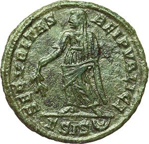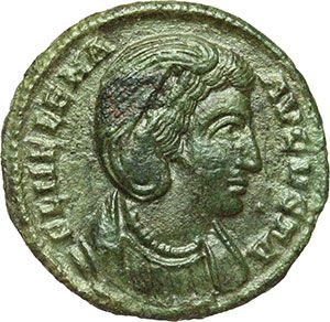Roman Imperial. Helena, mother of Constantine I. AE 18 mm. Siscia. Obv.: FL HELENA AVGVSTA. Draped bust right. Rev.: SECVRITAS REIPVBLICE. Helena standing facing, head left, holding branch in right hand. G SIS (double crescent) in exergue. RIC 218. AE. g. 3.28 Green patina. EF. Impero Romano. Elena, madre di Costantino I. AE 18 mm. Siscia. D/ FL HELENA AVGVSTA. Busto drappeggiato a destra. R/ SECVRITAS REIPVBLICE. Elena, stante di fronte con il capo a sinistra, tiene un ramoscello con la mano destra. In esergo: G SIS doppia crescente. RIC 218. AE. g. 3.28 Patina verde. SPL.