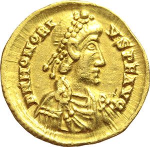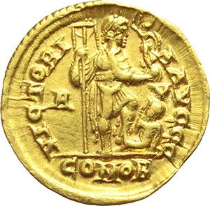 Roman Imperial. Honorius (393-423). Solidus, Ravenna. Obv.: DN HONORIVS PF AVG. Diademed, draped and cuirassed bust right. Rev.: VICTORIA AVGGG. Emperor standing right, left foot on bound captive, holding standard and Victory on globe. R-V across field. COMOB in exergue. LRC 735. AU. g. 4.41 About EF. Impero Romano. Onorio (393-423). Solido, Ravenna. D/ DN HONORIVS PF AVG. Busto diademato, drappeggiato e corazzato a destra. R/ VICTORIA AVGGG. L'imperatore, stante a destra, tiene stendardo e Vittoria su globo e calpesta con il piede sinistro un prigioniero. Nel campo, R-V. In esergo: COMOB. LRC 735. AU. g. 4.41 qSPL.