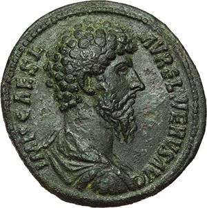 Roman Imperial. Lucius Verus (161-169). Sestertius. Obv.: IMP CAES L AVREL VERVS AVG. Bareheaded, draped and cuirassed bust right. Rev.: CONCORD AVGVSTOR TR P COS II SC. Marcus Aurelius, holding roll in left hand, and Lucius Verus standing confronted, clasping hands. RIC 1278. C. 24. AE. g. 24.63 mm. 34.50 Good VF+. Superb. Impero Romano. Lucio Vero (161-169). Sesterzio. D/ IMP CAES L AVREL VERVS AVG. Busto a testa nuda, drappeggiato e corazzato a destra. R/ CONCORD AVGVSTOR TR P COS II SC. Marco Aurelio e Lucio Vero, stanti uno di fronte all'altro, si stringono la mano. Il primo tiene con la sinistra un rotolo di pergamena. RIC 1278. C. 24. AE. g. 24.63 mm. 34.50 Bel BB+. Un esemplare superbo.