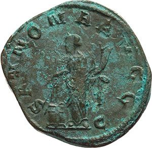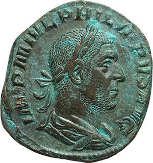 Roman Imperial. Philip I (244-249). Sestertius. Obv.: IMP M IVL PHILIPPVS AVG. Laureate, draped and cuirassed bust right. Rev.: ANNONA AVGG SC. Annona standing left, holding grain ears over modius and cornucopiae. RIC 168. AE. g. 17.40 mm. 30.00 About EF/VF. Impero Romano. Filippo I (244-249). Sesterzio. D/ IMP M IVL PHILIPPVS AVG. Busto laureato, drappeggiato e corazzato a destra. R/ ANNONA AVGG SC. Annona stante a sinistra tiene spighe di grano su modio e cornucopia. RIC 168. AE. g. 17.40 mm. 30.00 qSPL/BB. Un ritratto di grande intensità espressiva. Patina cuoio con riflessi verde turchese.