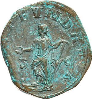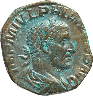 Roman Imperial. Philip I (244-249). Sestertius. Obv.: IMP M IVL PHILIPPVS AVG. Laureate, draped and cuirassed bust right. Rev.: [LAET] FVNDATA SC. Laetitia standing left, foot on prow, holding patera and rudder. RIC 176. AE. g. 18.21 mm. 29.50 R. Good VF+. Rare. Impero Romano. Filippo I (244-249). Sesterzio. D/ IMP M IVL PHILIPPVS AVG. Busto laureato, drappeggiato e corazzato a destra. R/ [LAET] FVNDATA SC. Laetitia, stante a sinistra con piede su prua, tiene patera e timone. RIC 176. AE. g. 18.21 mm. 29.50 R. Bel BB+. Raro. Patina cuoio con sfumature verde turchese.