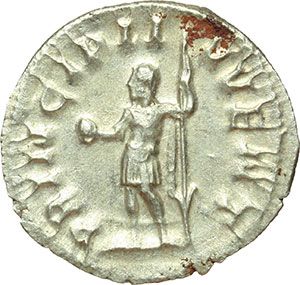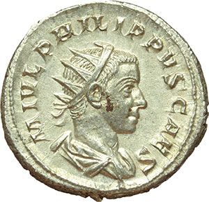Roman Imperial. Philip II Caesar (244-247). Antoninianus. Obv.: M IVL PHILIPPVS CAES. Radiate, draped and cuirassed bust right. Rev.: PRINCIPI IVVENT. Philip in military outfit standing left, holding globe and inverted spear. RIC 218 d. AG. g. 4.14 mm. 22.00 About FDC. Impero Romano. Filippo II Cesare (244-247). Antoniniano. D/ M IVL PHILIPPVS CAES. Busto radiato, drappeggiato e corazzato a destra. R/ PRINCIPI IVVENT. Filippo figlio in abito militare stante a sinistra, tiene globo e lancia rovesciata. RIC 218 d. AG. g. 4.14 mm. 22.00 qFDC.