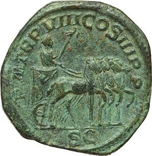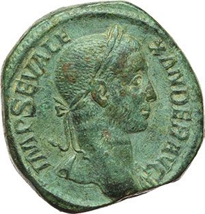 Roman Imperial. Severus Alexander (222-235). Sestertius. Obv.: IMP SEV ALEXANDER AVG. Laureate head right, drapery on left shoulder. Rev.: PM TR P VIII COS III PP SC. Emperor driving quadriga right, holding sceptre surmounted by eagle. RIC 495. C.377(Fr.25). AE. g. 27.99 mm. 33.00 R. Rare. A very beautiful coin. Green patina About EF. Impero Romano. Alessandro Severo (222-235). Sesterzio. D/ IMP SEV ALEXANDER AVG. Testa laureata a destra, con drappeggio sulla spalla sinistra. R/ PM TR P VIII COS III PP SC. L'imperatore su quadriga al passo a destra tiene scettro sormontato da aquila. RIC 495. C.377(Fr.25). AE. g. 27.99 mm. 33.00 R. Raro e di grande bellezza. Patina verde. qSPL.