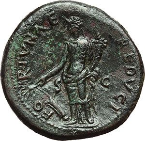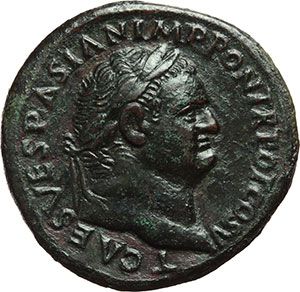 Roman Imperial. Titus (79-81). Sestertius. Obv.: T CAES VESPASIAN IMP PON TR POT COS V. Laureate head right. Rev.: FORTVNAE REDVCI SC. Fortuna standing left, holding rudder set on globe and cornucopia. RIC 672 var. (CAESAR). AE. g. 24.11 mm. 34.00 R. Light cleaning marks. Good VF+. Impero Romano. Tito (79-81). Sesterzio. D/ T CAES VESPASIAN IMP PON TR POT COS V. Testa laureata a destra. R/ FORTVNAE REDVCI SC. Fortuna stante a sinistra tiene timone su globo e cornucopia. RIC 672 var. (CAESAR). AE. g. 24.11 mm. 34.00 R. Pulito con perizia. Bel BB+.