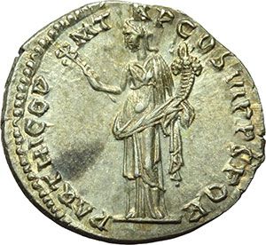 Roman Imperial. Trajan (98-117). Denarius, 114-117. Obv.: IMP CAES NER TRAIAN OPTIM AVG GERM DAC. Laureate and draped bust right. Rev.: PARTHICO P M TR P COS VI P P S P Q R. Felicitas standing facing, head left, holding caduceus and cornucopiae. RIC 332. C. 191. AG. g. 3.44 mm. 19.00 FDC. Impero Romano. Traiano (98-117). Denario, 114-117. D/ IMP CAES NER TRAIAN OPTIM AVG GERM DAC. Busto laureato e drappeggiato a destra. R/ PARTHICO P M TR P COS VI P P S P Q R. Felicitas stante di fronte, con il capo volto a sinistra, tiene caduceo e cornucopia. RIC 332. C. 191. AG. g. 3.44 mm. 19.00 FDC.