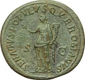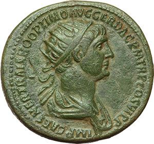 Roman Imperial. Trajan (98-117). Dupondius. Obv.: IMP CAES NER TRAIANO OPTIMO AVG GER DAC PM TR P COS VI PP. Radiate and draped bust right. Rev.: SENATVS POPVLUSQUE ROMANVS SC. Felicitas standing left, holding caduceus and cornucopiae. RIC 674. AE. g. 14.36 mm. 28.00 Emerald green patina. About EF. Impero Romano. Traiano (98-117). Dupondio. D/ IMP CAES NER TRAIANO OPTIMO AVG GER DAC PM TR P COS VI PP. Busto radiato e drappeggiato a destra. R/ SENATVS POPVLUSQUE ROMANVS SC. Felicitas stante a sinistra tiene caduceo e cornucopia. RIC 674. AE. g. 14.36 mm. 28.00 Patina verde smeraldo. qSPL.