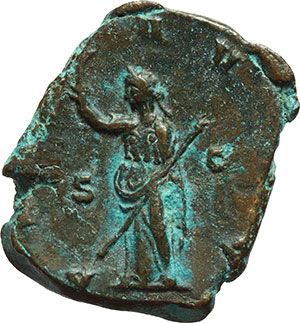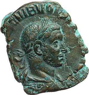 Roman Imperial. Volusian (251-253). Sestertius. Obv.: [ ]C VIB VOLV [ ]. Laureate, draped and cuirassed bust right. Rev.: PA[X] AV[G]G SC. Pax standing left, holding branch and sceptre. RIC 256. AE. g. 15.60 mm. 28.00 R. EF/About EF. Wonderful portrait. Impero Romano. Volusiano (251-253). Sesterzio. D/ [ ]C VIB VOLV [ ]. Busto laureato, drappeggiato e corazzato a destra. R/ PA[X] AV[G]G SC. Pax stante a sinistra tiene ramoscello e scettro. RIC 256. AE. g. 15.60 mm. 28.00 R. Tondello irregolarmente quadrangolare. SPL/qSPL. Un ritratto di stile magistrale. Patina cuoio con sfumature verde turchese.