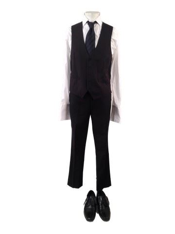 George(Colin Farrell) screen worn, hero, black 3-piece "Rossini" suit, white "Zegna" dress shirt, black tie with navy stripes "Tom Ford", black leather belt, black leather with square toe and lace up"Kenneth Cole" shoes. Wardrobe tag included, worn in scenes 145-147.