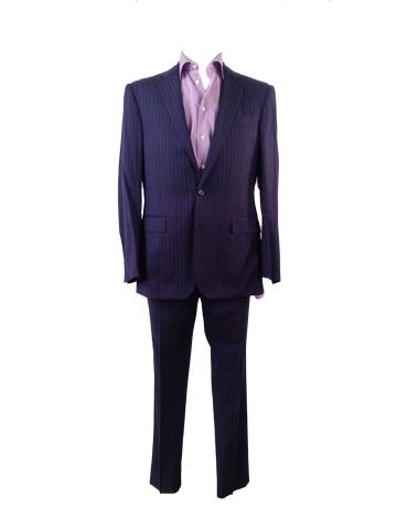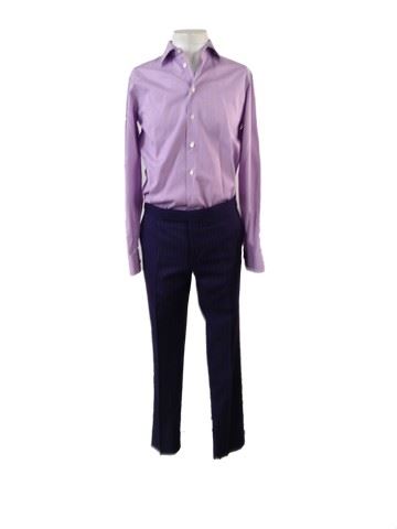 George(Colin Farrell) screen worn, hero, navy 2-piece pin stripe "Ralph Lauren" suit, purple mini checkered "Eton" dress shirt(15.5). Wardrobe tag included, worn in scenes 200-211.