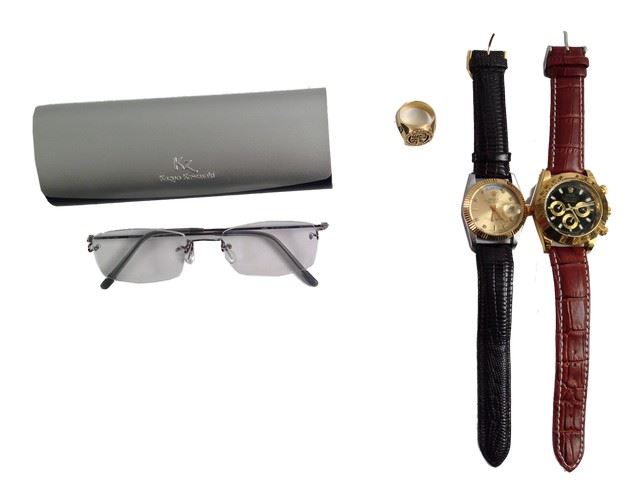 Jesse Salinas (Tony Plana) screen used, prop "Rolex" watch with gold face and brown leather band, prop Rolex watch with gold face and dark brown leather band, "Kazuo Kawasaki" reading glasses, gold school ring, "Loyola Marymount School of Law".(12x10)