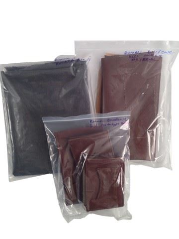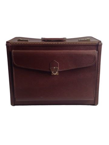 Roman's screen used, hero, brown leather briefcase filled with extra brown thread, brown leather pocket material, prototype pockets, pocket zippers, prototype name plates, pocket material templates, and extra pocket buttons and tools.(18x14).