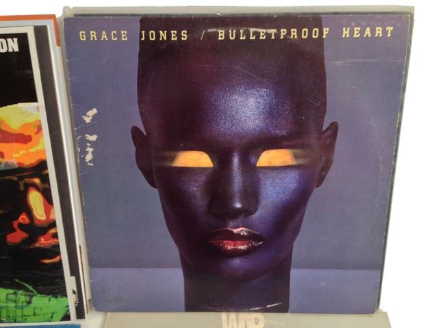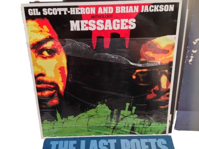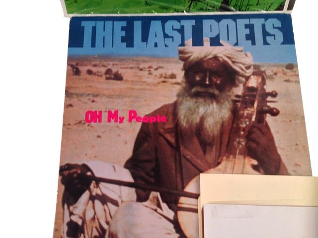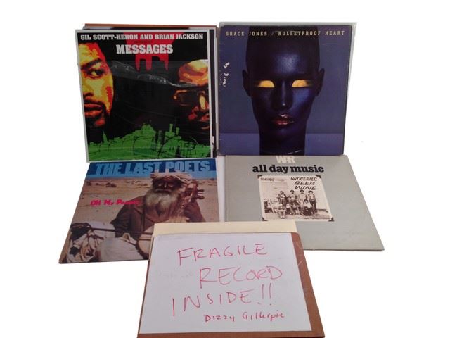 Roman's screen used, record collection; includes 9 records, 4 by "Gil- Scott Heron", "Grace Jones Bulletproof", "Charlie Parker, Bird is Free", "War all day music", "Dizzie Gillespie", "The Last Poets, Oh my People".(13x13)