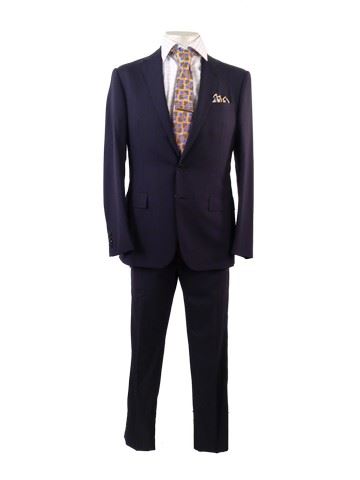 George (Colin Farrell) screen worn, hero, 2-piece navy blue "Ralph Lauren "suit, white with blue checkered print "Eton" dress shirt, gold with blue square"Zegna" tie, gold with silver trim tie bar. Wardrobe tag included, worn in scene 136.
