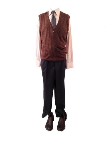 Roman's screen worn, hero, black and grey sport coat "Jack victor", brown tweed sweater vest"Italion Yarn", tan dress shirt "Anto Beverly Hills"(DW March 2017 sewn into the collar", grey dress slacks "Zinotto". Wardrobe tag included, worn in scenes 42-48.