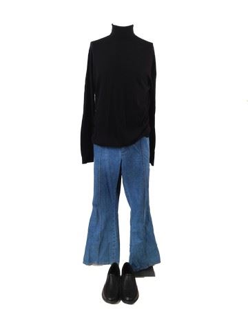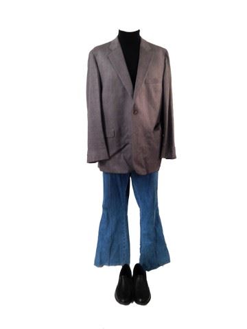 Roman's screen worn, hero, black and grey sport coat "Jack Victor", black turtleneck sweater "H&M"(XL), light wash blue jeans bell bottom custom made from "United Wash", black loafers "Rockport"(11.5) Wardrobe tag included. Worn in 67-71.