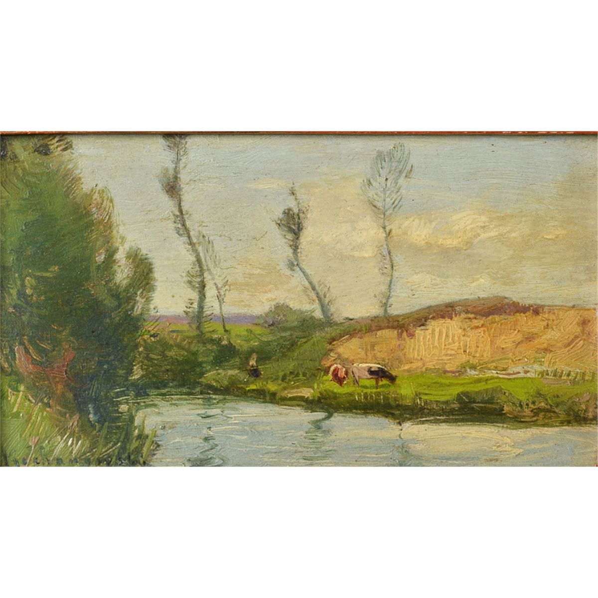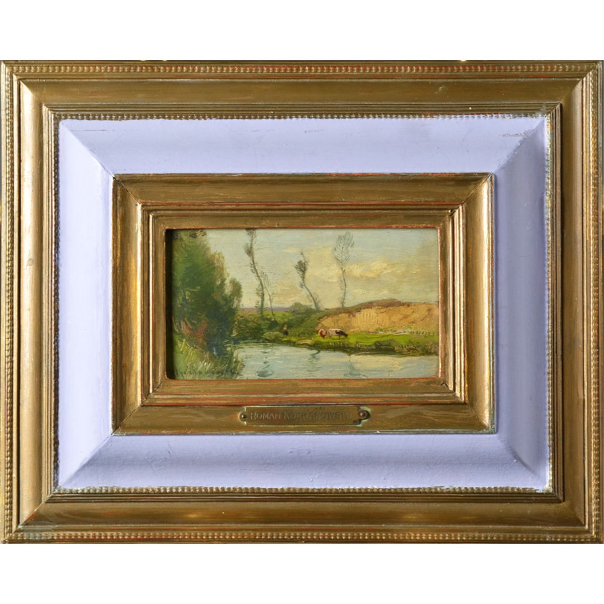 Painted to depict cows feeding along a stream. This painting was in a traveling exhibition by the American Federation of Arts, titled "Landscape." It was also exhibited on loan to the Metropolitan Museum of Art, Exhibit Polish Paintings. Roman Kochanowski (1857-1945), Poland was known for landscape and figural paintings. Signed LL. 3.5" H x6.75" W, sight, 11.75" H x 14.75" W, framed. Circa early 20th century.